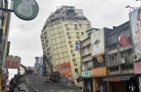 圖為4月23日凌晨發(fā)生規(guī)模6.3地震,造成花蓮市區(qū)富凱大飯店傾斜。(臺灣“中時新聞網(wǎng)”資料照)