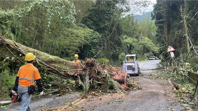 南投縣鹿谷山區(qū)28日下午1點多傳出大樹倒塌壓斷高壓線,造成2257戶停電,臺電派出10名工作人員加緊搶修。(圖片來源:臺灣“中時新聞網”)
