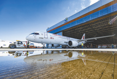 圖為一架C919飛機(jī)出機(jī)庫(kù),進(jìn)行交付前的最后檢查。