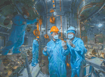 四川省成都市,中核集團(tuán)核工業(yè)西南物理研究院科技人員在新一代人造太陽(yáng)真空室內(nèi)解決安裝調(diào)試過(guò)程中的技術(shù)難點(diǎn)。