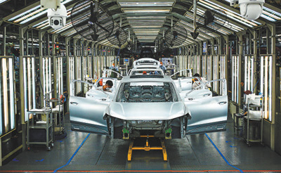 廣東省佛山市一汽大眾汽車(chē)智慧工廠內(nèi),新能源汽車(chē)生產(chǎn)線(xiàn)開(kāi)足馬力。