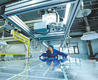 甘肅省張掖市民樂(lè)生態(tài)工業(yè)園區(qū)的甘肅大民新材料光伏組件生產(chǎn)線(xiàn)上,工作人員正在檢測(cè)覆膜前光伏組件。