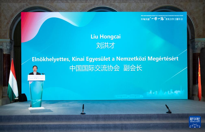 ?5月2日,在匈牙利布達佩斯,中國國際交流協(xié)會副會長劉洪才在中匈共建“一帶一路”務實合作主題年會上發(fā)言。新華社記者 張帆 攝