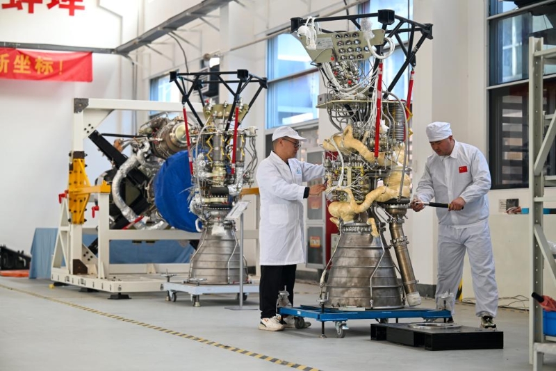 2024年3月11日,在安徽九州云箭航天技術(shù)有限公司生產(chǎn)基地,技術(shù)人員對即將交付的液體火箭發(fā)動機(jī)進(jìn)行最后的檢查。 新華社發(fā)(黃洋洋攝)