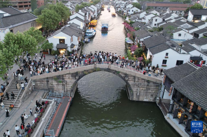 5月2日,游客在大運河江蘇無錫段的清名橋歷史文化街區(qū)游覽(無人機照片)。新華社發(fā)(還月亮攝)