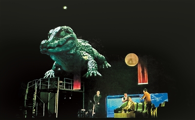 問:雖然話劇名字叫《鱷魚》,但舞臺(tái)上沒有真實(shí)的鱷魚,比如說雕塑,或者是一個(gè)演員去扮演鱷魚,而是通過特效呈現(xiàn)出的鱷魚,為何這么構(gòu)想?