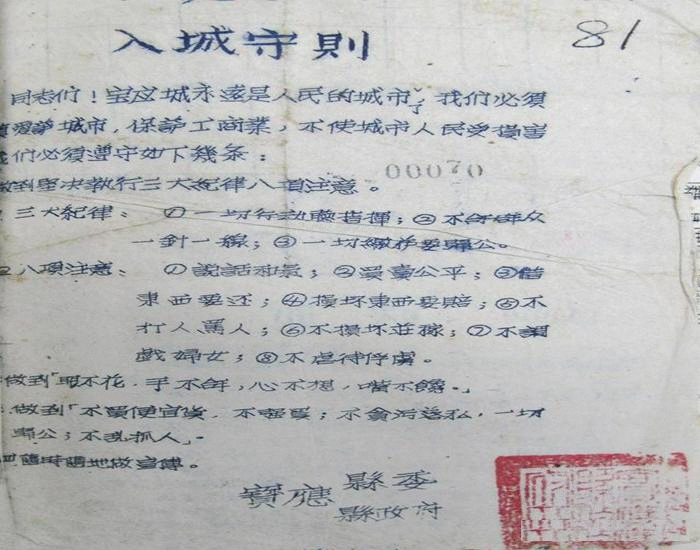 同志們!寶應(yīng)城永遠是人民的城市了,我們必須認真愛護城市,保護工商業(yè),不使城市人民受損害,我們必須遵守如下幾條,做到堅決執(zhí)行“三大紀律八項注意”。