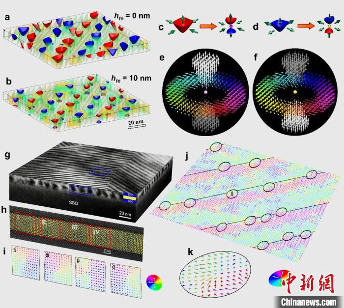 隨后,他們利用脈沖激光沉積技術(shù)在外延生長鈧酸釤(SmScO3)襯底上生長由釕酸鍶(SrRuO3)電極夾持的超薄鈦酸鉛(PbTiO3)薄膜(5納米),并通過像差校正透射電子顯微鏡對平面樣和截面樣進行觀察,最終在超薄鈦酸鉛薄膜中觀察到面內(nèi)面外呈發(fā)散和匯聚特征的極化“布洛赫點”。(完)