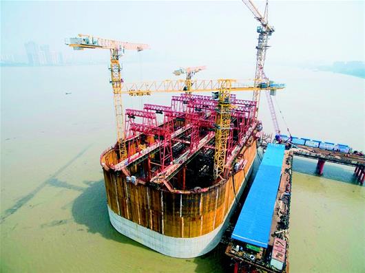 2016年8月,楊泗港長(zhǎng)江大橋2號(hào)塔沉井下沉到位。(圖源;湖北日?qǐng)?bào))