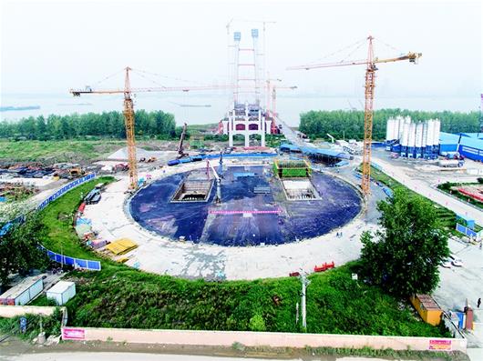 2017年9月24日,楊泗港橋南錨碇完工。 (圖源;湖北日?qǐng)?bào))