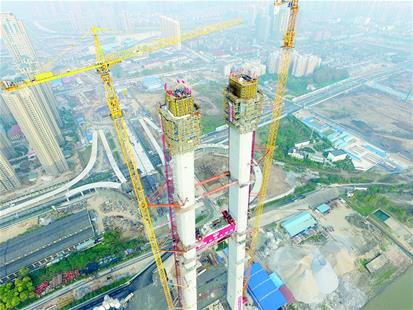 2017年11月21日,封頂后的楊泗港長(zhǎng)江大橋北主塔。(圖源;湖北日?qǐng)?bào))