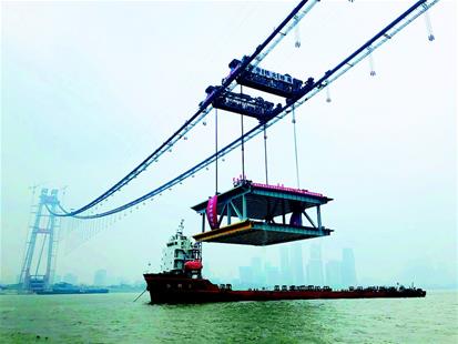 2018年11月,楊泗港橋架設(shè)首片梁。 (圖源;湖北日?qǐng)?bào))