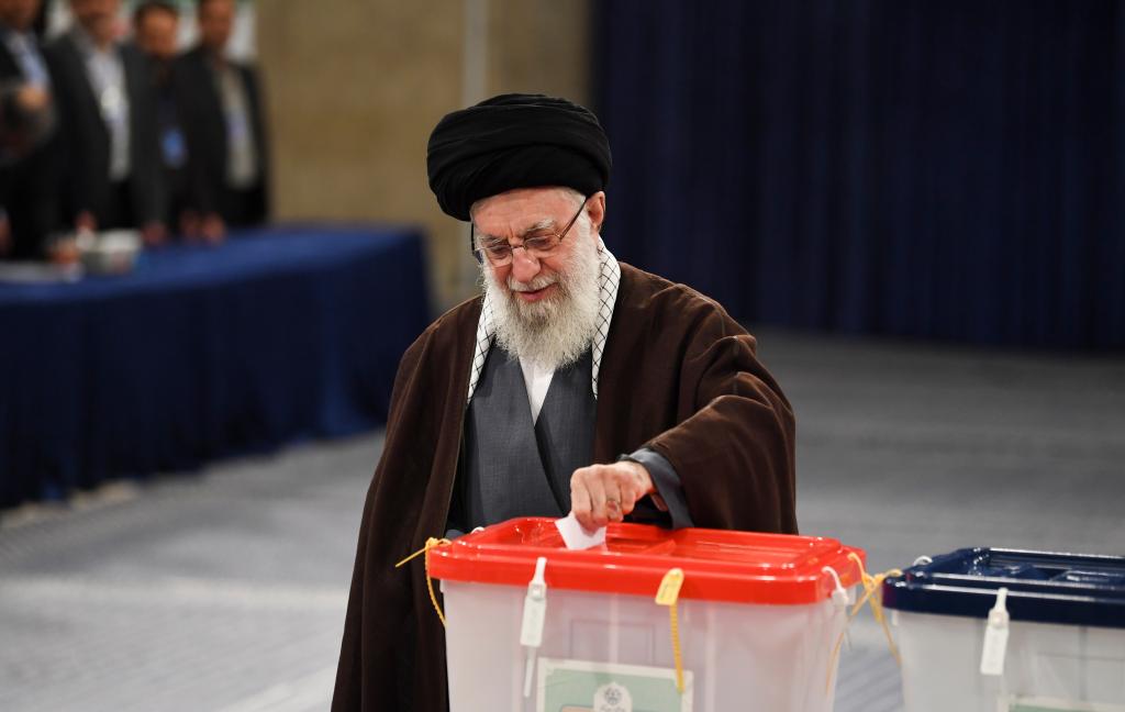 3月1日,在伊朗首都德黑蘭,伊朗最高領袖哈梅內伊在設于領袖府內的投票站參加伊朗議會選舉投票。(圖源:新華社)