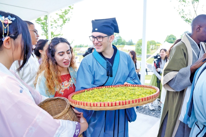 ▲ 來自浙江科技大學(xué)國際學(xué)院的外國學(xué)生在安吉參加國際茶研學(xué)活動(dòng)。