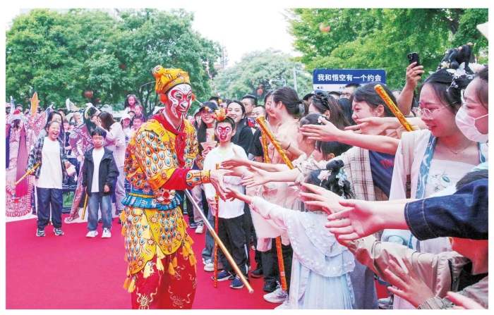 陜西省戲曲研究院長期以來注重用新的表現(xiàn)方式傳播、弘揚秦腔藝術(shù)。今年春節(jié)期間,該院參演的《山河詩長安》在央視春晚西安分會場上演,引發(fā)廣大網(wǎng)友熱議。今年“五一”假期,該院推出了文旅演出版秦腔神話劇《西游記》,把與游客的互動場景搬到劇場外,讓“猴哥”“八戒”在人流密集的西安旅游地標(biāo)——大唐不夜城“上崗”,引導(dǎo)過往群眾走進“梨園”,感受戲曲魅力。