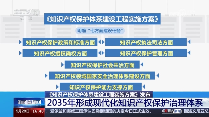 國(guó)家知識(shí)產(chǎn)權(quán)局5月28日舉行新聞發(fā)布會(huì),重點(diǎn)介紹《知識(shí)產(chǎn)權(quán)保護(hù)體系建設(shè)工程實(shí)施方案》(以下簡(jiǎn)稱《方案》)有關(guān)情況。《方案》明確,到2035年,知識(shí)產(chǎn)權(quán)保護(hù)體系和保護(hù)能力現(xiàn)代化基本實(shí)現(xiàn),形成政府履職盡責(zé)、執(zhí)法部門嚴(yán)格監(jiān)管、司法機(jī)關(guān)公正司法、經(jīng)營(yíng)主體規(guī)范管理、行業(yè)組織自律自治、社會(huì)公眾誠(chéng)信守法的現(xiàn)代化知識(shí)產(chǎn)權(quán)保護(hù)治理體系。