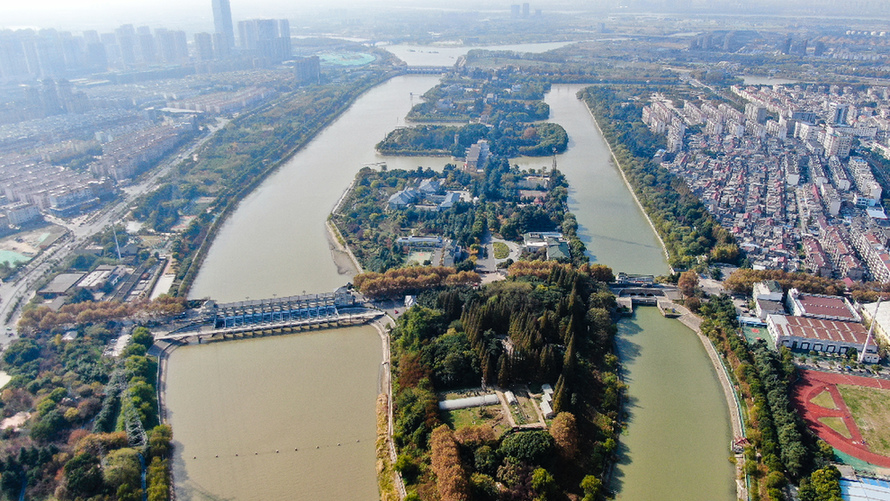 位于江蘇揚州的南水北調東線工程源頭江都水利樞紐(2020年11月14日攝,無人機照片)。(圖源:新華社)