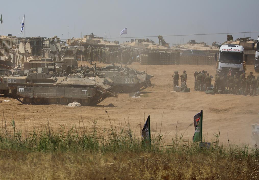 5月8日,以軍部隊(duì)在以色列南部凱雷姆沙洛姆口岸附近部署。(圖源:新華社)