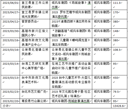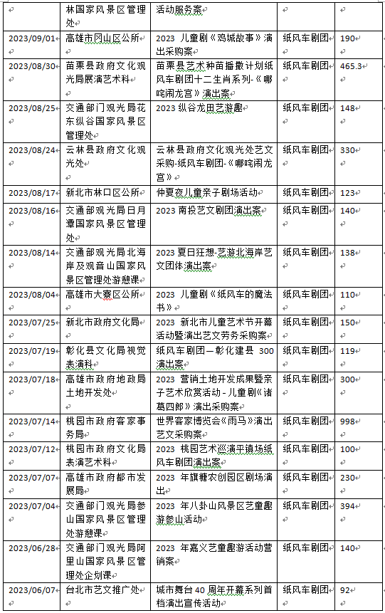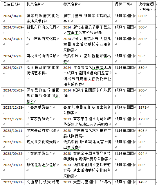表格:2023-2024年4月紙風(fēng)車劇團(tuán)獲得公部門標(biāo)案數(shù)(貨幣單位:新臺(tái)幣萬元)