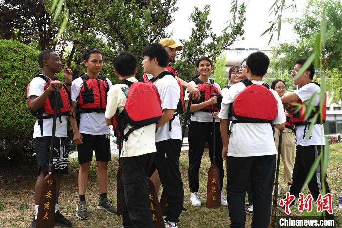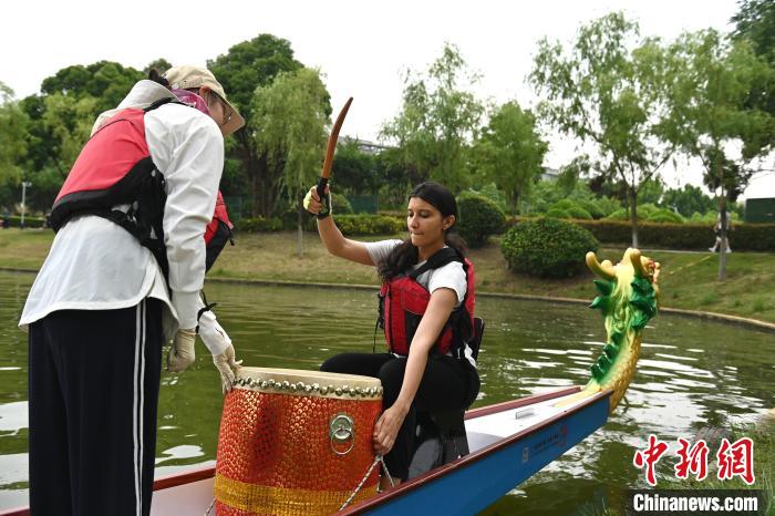 在安徽建筑大學(xué)校內(nèi)的“易海”湖上,二十多位大學(xué)生正齊心協(xié)力,積極備戰(zhàn)他們的第一場(chǎng)龍舟比賽,其中還有四位外籍留學(xué)生參與其中。韓蘇原 攝