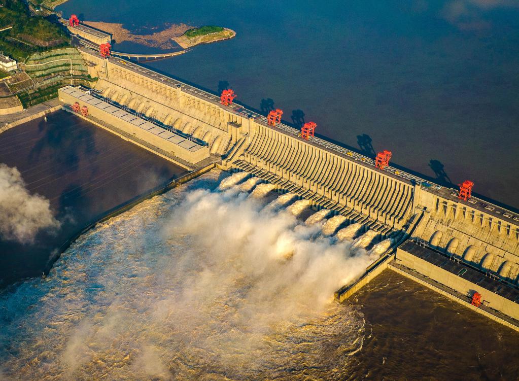 2020年8月19日,長(zhǎng)江三峽水利樞紐工程開(kāi)啟泄洪深孔泄洪(無(wú)人機(jī)照片)。(圖源:新華社)