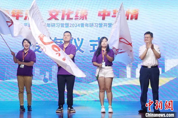 向香港團(tuán)、澳門(mén)團(tuán)、臺(tái)灣團(tuán)營(yíng)員代表授營(yíng)旗?!∩虾V腥A職業(yè)教育社供圖