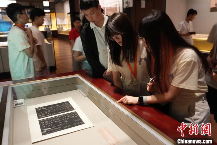 7月4日,2024“未來能源領(lǐng)袖”兩岸青年交流營的營員參觀位于北京的中國國家版本館中央總館。本次交流營以能源低碳轉(zhuǎn)型和中華文化為主題。圖為臺灣青年觀看館內(nèi)展出的《西樓蘇帖》。中新網(wǎng)記者 崔楠 攝