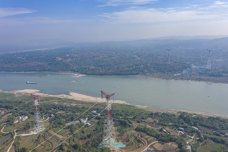 2022年9月13日在重慶市江津區(qū)拍攝的白鶴灘-浙江±800千伏特高壓直流輸電工程重慶段(右)長江大跨越施工現(xiàn)場(無人機(jī)照片)。(圖源:新華社)