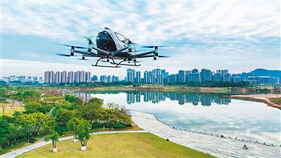 圖為億航無人駕駛載人航空器在廣州九龍湖上空飛行。