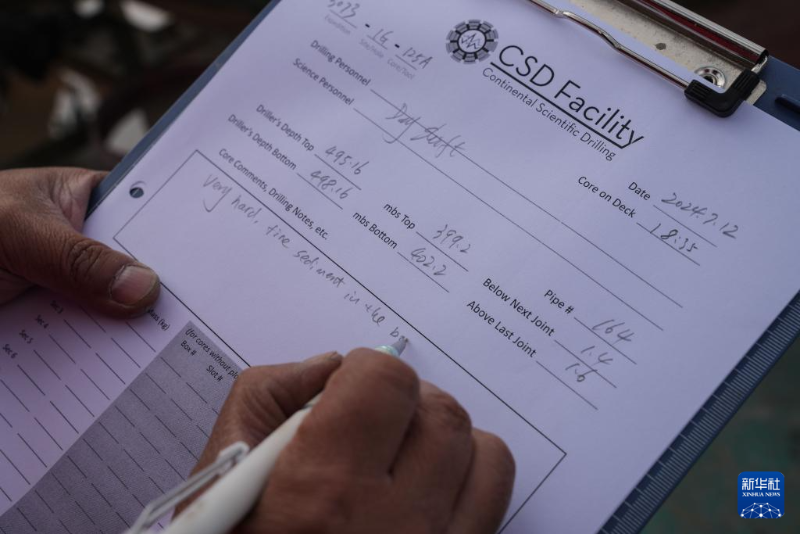 7月12日,科研隊(duì)員在登記納木錯(cuò)湖底402.2米深度湖泊巖芯樣品信息。新華社記者 晉美多吉 攝