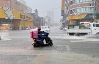 永大路二段傳出積水后,部分民眾辛苦推著拋錨的機(jī)車(chē)前進(jìn),不少人更躲進(jìn)超商避雨,還好傍晚6點(diǎn)左右雨停后,積水已迅速消退。