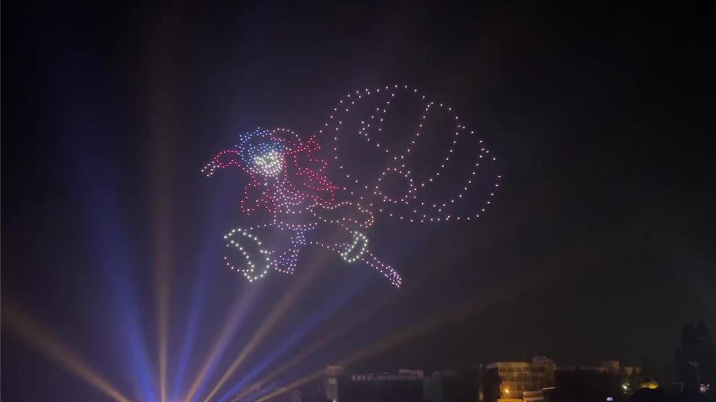 圖為16日晚上花火節(jié)升空的無(wú)人機(jī)前段圖案,雖不完全但還可辨認(rèn)。(許逸民攝,臺(tái)灣“中時(shí)新聞網(wǎng)”)