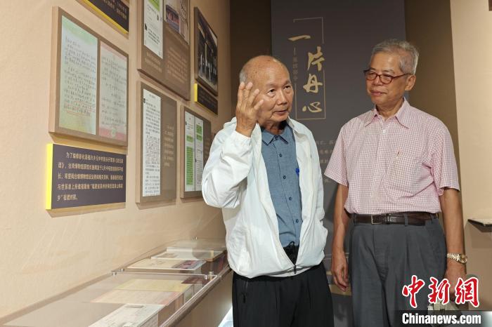 7月19日,施明發(fā)(左)在中國閩臺緣博物館講述兩岸梁氏家族的族譜對接故事?!枪跇?biāo) 攝