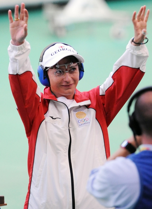 2008年8月10日,格魯吉亞選手妮諾·薩盧克瓦澤賽后向觀眾揮手致意。當(dāng)日,在2008北京奧運會上她獲得女子10米氣手槍銅牌。新華社記者 徐家軍 攝