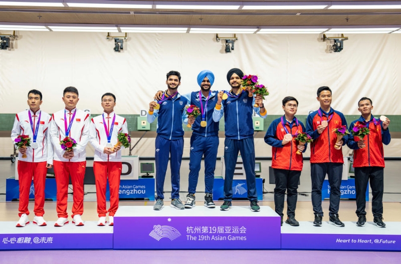 2023年9月28日,冠軍印度隊(中)、亞軍中國隊(左)和季軍越南隊在杭州亞運會男子10米氣手槍團體項目頒獎儀式上合影。新華社記者 孫非 攝