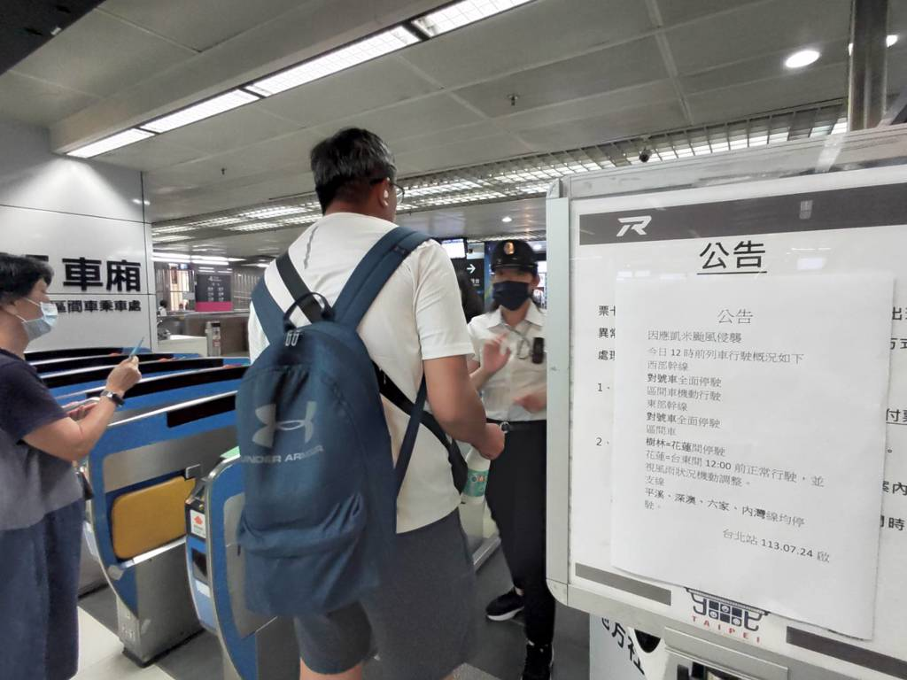 受到臺風(fēng)“格美”來襲影響,臺鐵公司貼出西部干線、東部干線、南回線24日中午12時前停駛的公告,站務(wù)人員向旅客說明車班是否有停駛等問題。(劉宗龍攝,臺灣“中時新聞網(wǎng)”)