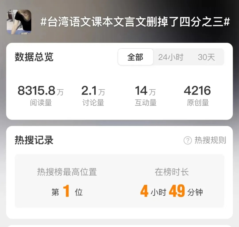 24日,一則“臺(tái)灣語(yǔ)文課本文言文刪掉了四分之三”的話(huà)題再次登上大陸社交媒體熱搜。貼文稱(chēng),臺(tái)灣高中課本的文言文從曾經(jīng)的60篇,刪減至新課綱中的15篇。范仲淹的《岳陽(yáng)樓記》、王羲之的《蘭亭集序》等多篇經(jīng)典古文作品都被刪掉。而有臺(tái)灣高中老師也曾在社交媒體上說(shuō),臺(tái)灣學(xué)生的寫(xiě)作能力正在以雪崩的速度崩壞。