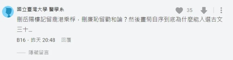 在刪掉眾多文言文的同時(shí),新課綱增加了《鹿港乘桴記》《畫(huà)菊自序》等臺(tái)灣古典散文。對(duì)此,島內(nèi)學(xué)生也頗為不滿(mǎn)。此前有臺(tái)灣大學(xué)學(xué)生在島內(nèi)社交論壇Dcard留言,不明白為何刪除《岳陽(yáng)樓記》和《廉恥》等文言文,卻留下清末、日據(jù)時(shí)期的作品《鹿港乘桴記》等。有網(wǎng)友回復(fù)表示,明顯是為了增加臺(tái)灣“自主”能見(jiàn)度。
