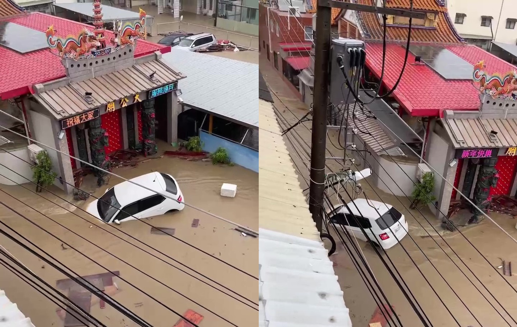 畫面顯示,大小區(qū)鹽埕巷的天公廟前已經(jīng)是一片汪洋,原本的道路不見蹤影,一輛白色轎車被洪水沖走,狀況堪憂。臺風(fēng)“格美”帶來的強降雨,不僅使大小區(qū)受災(zāi),整個高雄市多處傳出淹水災(zāi)情,初步估計至少有200起。茂林地區(qū)過去24小時內(nèi)累積雨量達到1000毫米,平地如美濃、岡山等地也超過100毫米的降雨量。