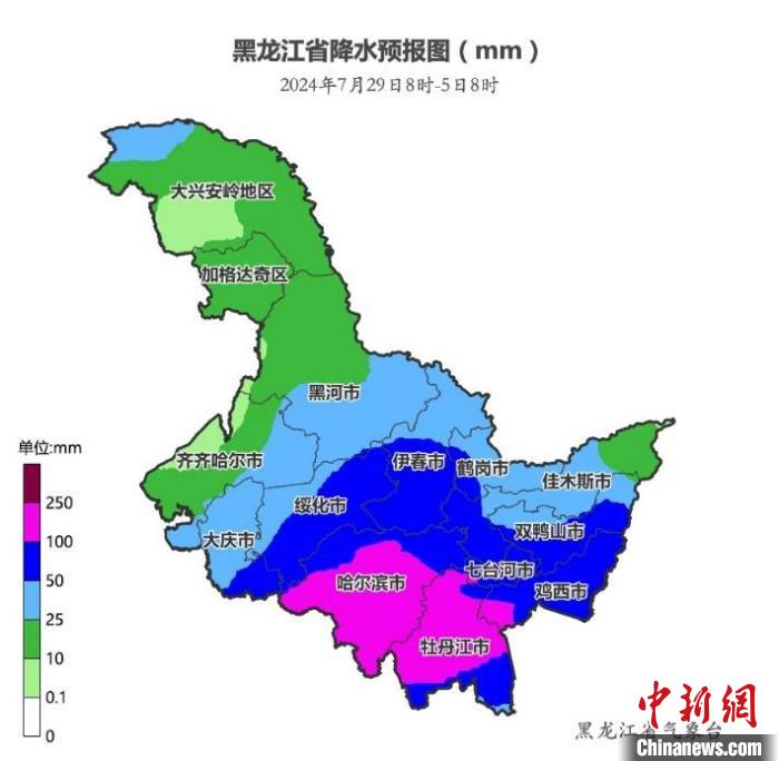 黑龍江省氣象局發(fā)布的天氣預(yù)報(bào)信息顯示,7月1日至28日,大興安嶺、黑河北部、伊春、齊齊哈爾南部、大慶南部、綏化、哈爾濱、佳木斯東部、雙鴨山東部、雞西、牡丹江累計(jì)降水量為50毫米至100毫米,其中大興安嶺中部、伊春南部、綏化北部、大慶南部、哈爾濱、雙鴨山東部、雞西東部、牡丹江的部分市縣降水量為100毫米至240毫米,其他地區(qū)25毫米至50毫米;與歷史同期相比,大興安嶺中部、大慶南部、哈爾濱東南部、牡丹江多一成至八成,其中牡丹江北部部分地區(qū)多九成至1.4倍,其他大部地區(qū)少兩成至八成。