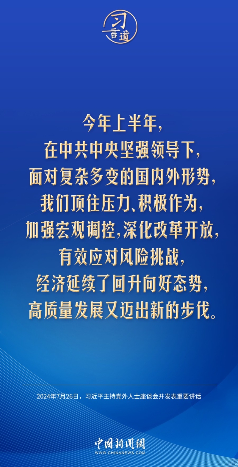 7月26日,中共中央在中南海召開黨外人士座談會(huì),就當(dāng)前經(jīng)濟(jì)形勢和下半年經(jīng)濟(jì)工作聽取各民主黨派中央、全國工商聯(lián)負(fù)責(zé)人和無黨派人士代表的意見和建議。中共中央總書記習(xí)近平主持座談會(huì)并發(fā)表重要講話強(qiáng)調(diào)——