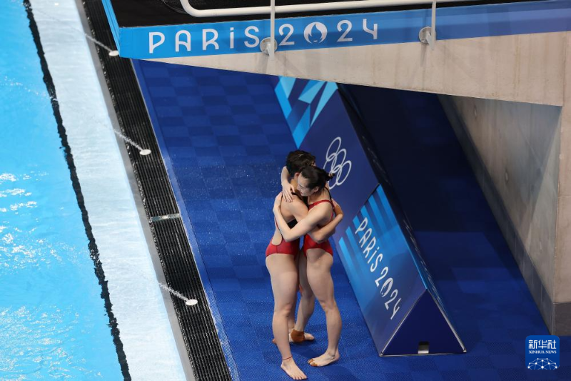 7月27日,中國選手昌雅妮(右)/陳藝文相擁慶祝。新華社記者 張玉薇 攝