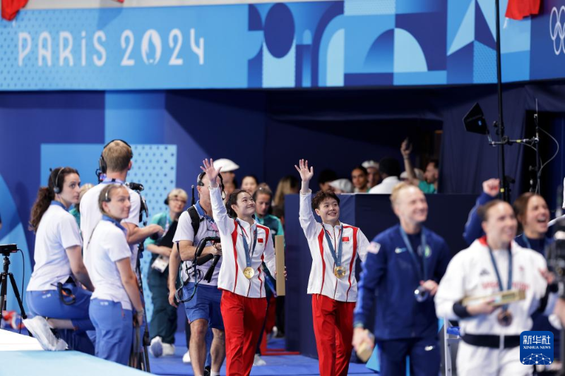7月27日,中國選手昌雅妮(中左)/陳藝文(中右)向觀眾揮手致意。新華社記者 張玉薇 攝