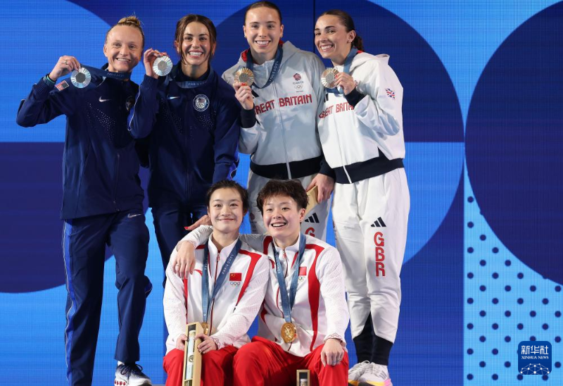 7月27日,冠軍中國選手昌雅妮(左四)/陳藝文(左三)、亞軍美國選手培根(左一)/庫克(左二)、季軍英國選手哈珀(右二)/米尤-詹森(右一)展示獎(jiǎng)牌。新華社記者 李穎 攝