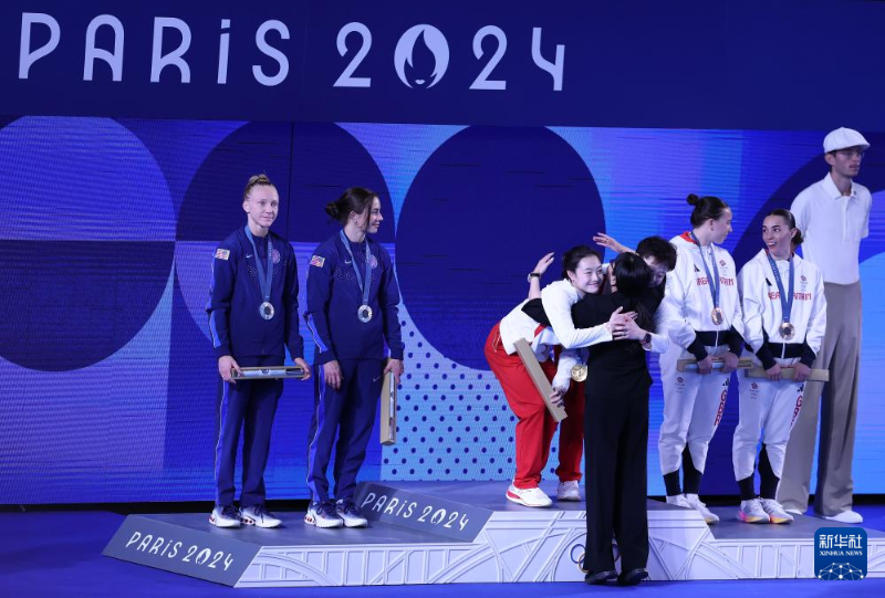 7月27日,冠軍中國選手昌雅妮(前左)/陳藝文(前右)、亞軍美國選手培根(后左一)/庫克(后左二)、季軍英國選手哈珀(后右二)/米尤-詹森(后右一)出席頒獎(jiǎng)儀式。新華社記者 李穎 攝