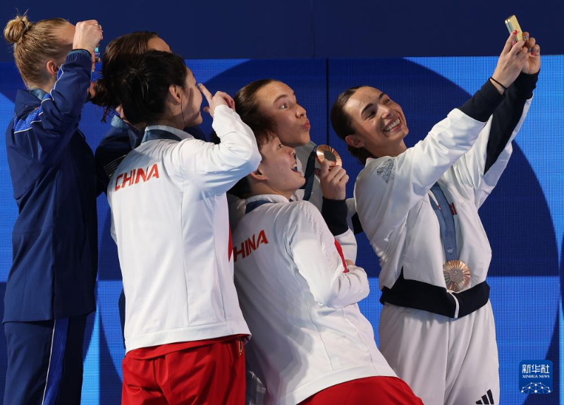 7月27日,獲獎(jiǎng)選手在頒獎(jiǎng)儀式上自拍。新華社記者 李穎 攝