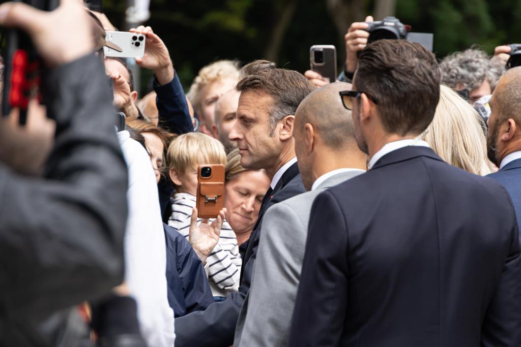 7月7日,在法國(guó)勒?qǐng)D凱,法國(guó)總統(tǒng)馬克龍?jiān)谕镀焙笈c民眾交流。(圖源:新華社)