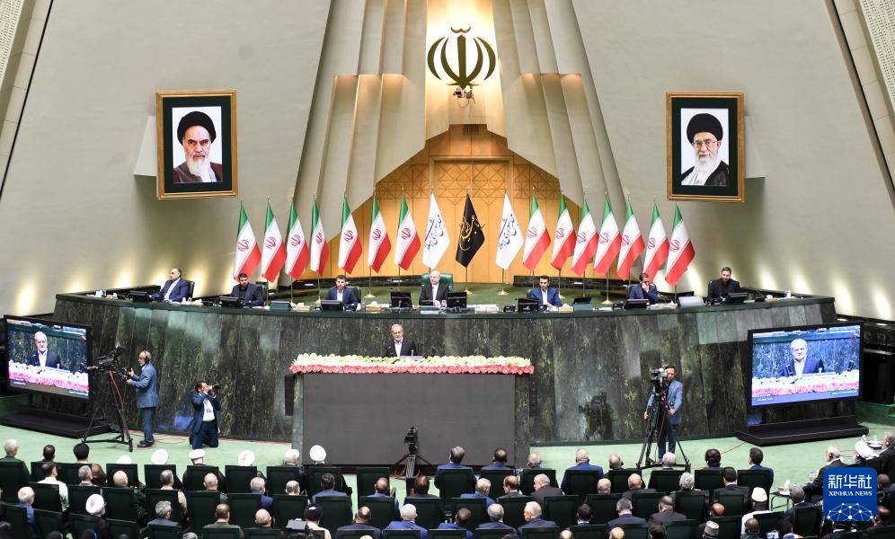 7月30日,佩澤希齊揚(yáng)(中)在伊朗德黑蘭的伊朗議會(huì)宣誓就任伊朗總統(tǒng)后發(fā)表就職演說。(圖源:新華社)