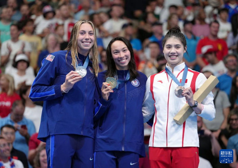 7月28日,冠軍美國選手胡斯克(中)、亞軍美國選手沃爾什(左)、季軍中國選手張雨霏在頒獎儀式上合影。新華社記者 杜宇 攝