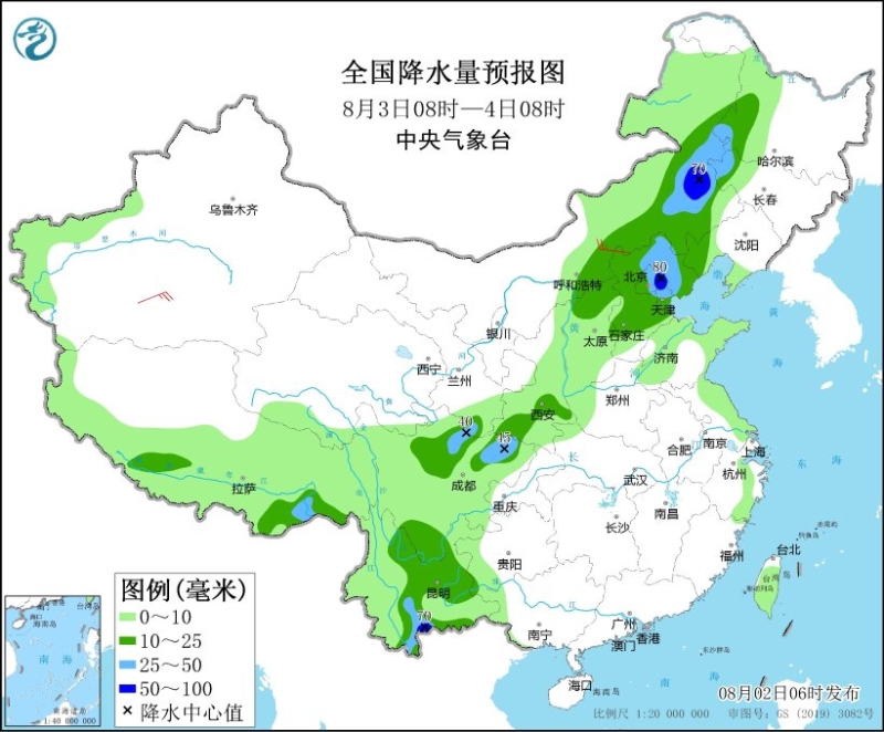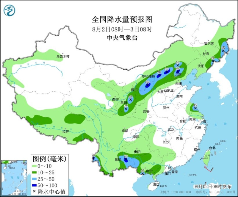 8月2日08時(shí)至3日08時(shí),甘肅東部和南部、寧夏大部、陜西北部、山西北部、內(nèi)蒙古中部、河北北部、北京、天津及黑龍江東南部、吉林東部、江蘇中部、貴州南部、廣西西部和南部、云南西部和東南部等地部分地區(qū)有中到大雨,其中,陜西北部、山西北部、內(nèi)蒙古中部、河北北部、云南東南部等地部分地區(qū)有暴雨(50~90毫米)。
